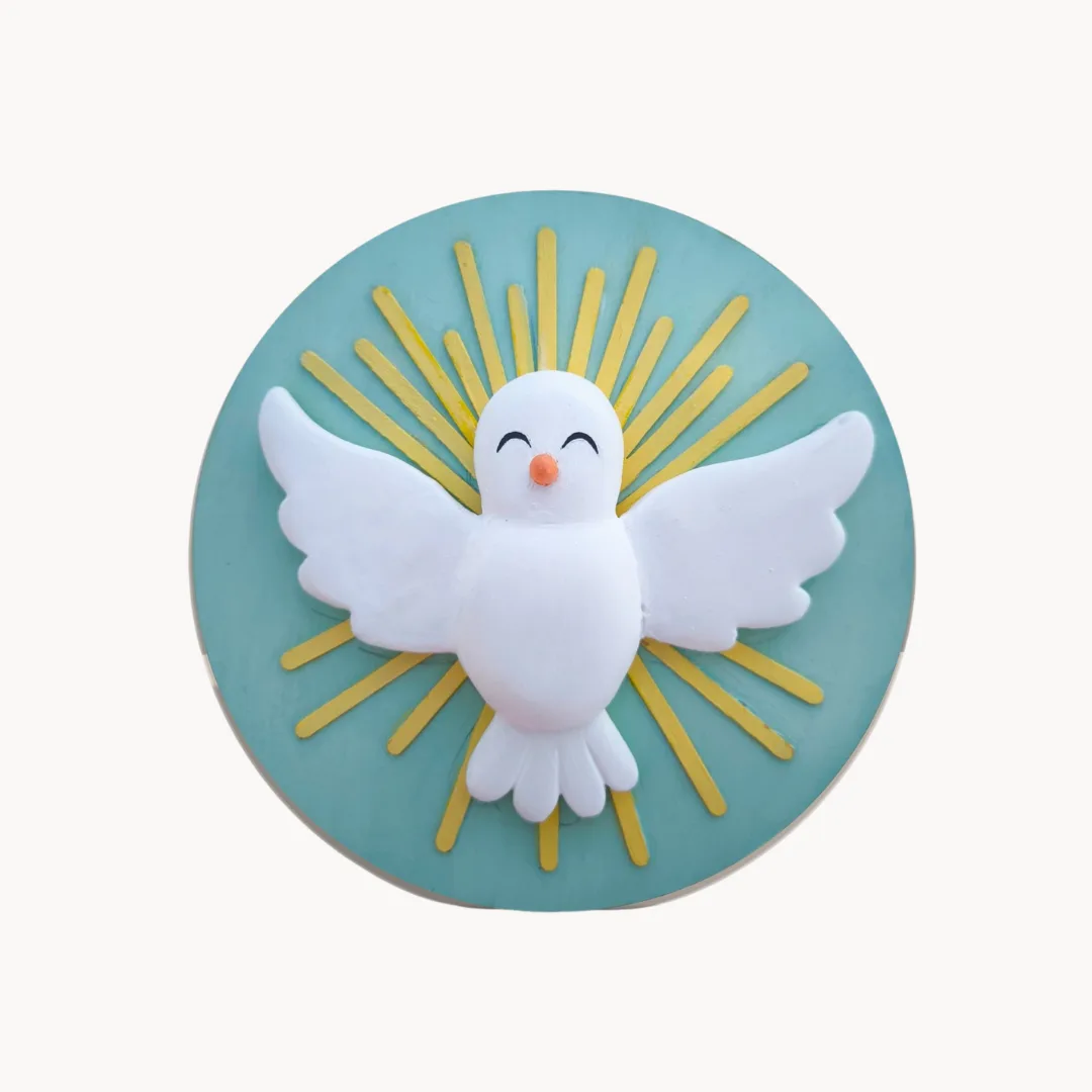 Cada medallón representa un símbolo de fe y protección, en un estilo dulce e infantil que invita a la paz y la oración.